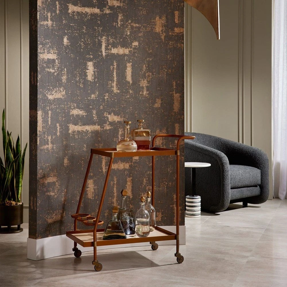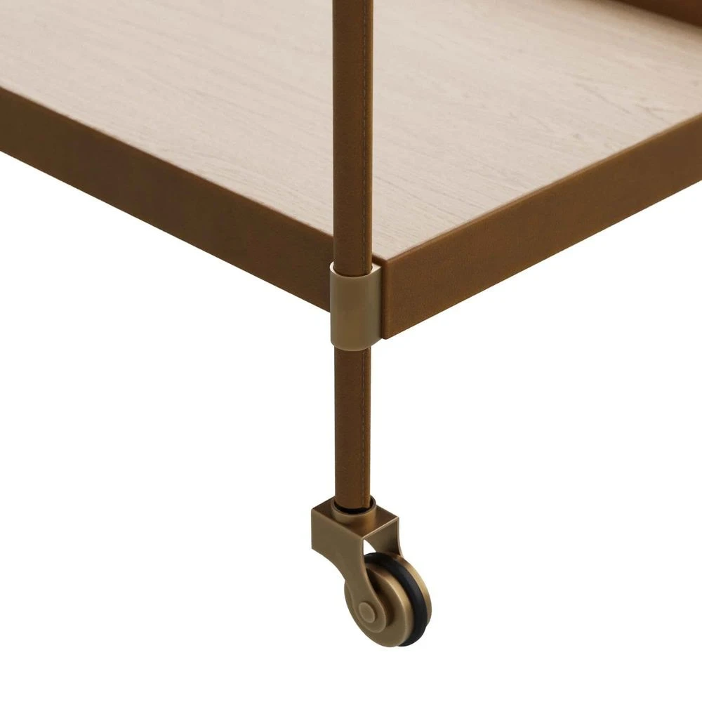 This angular bar cart maintains a light visual weight, ideal for tucking into small spaces or rolling from room to room. The Nika is crafted in a silhouette inspired by classic tea carts, with a frame wrapped in handsome russet leather and blonde oak serving trays. The portable bar features rings to secure bottles and castors accented in antique brass. Finishes will vary.