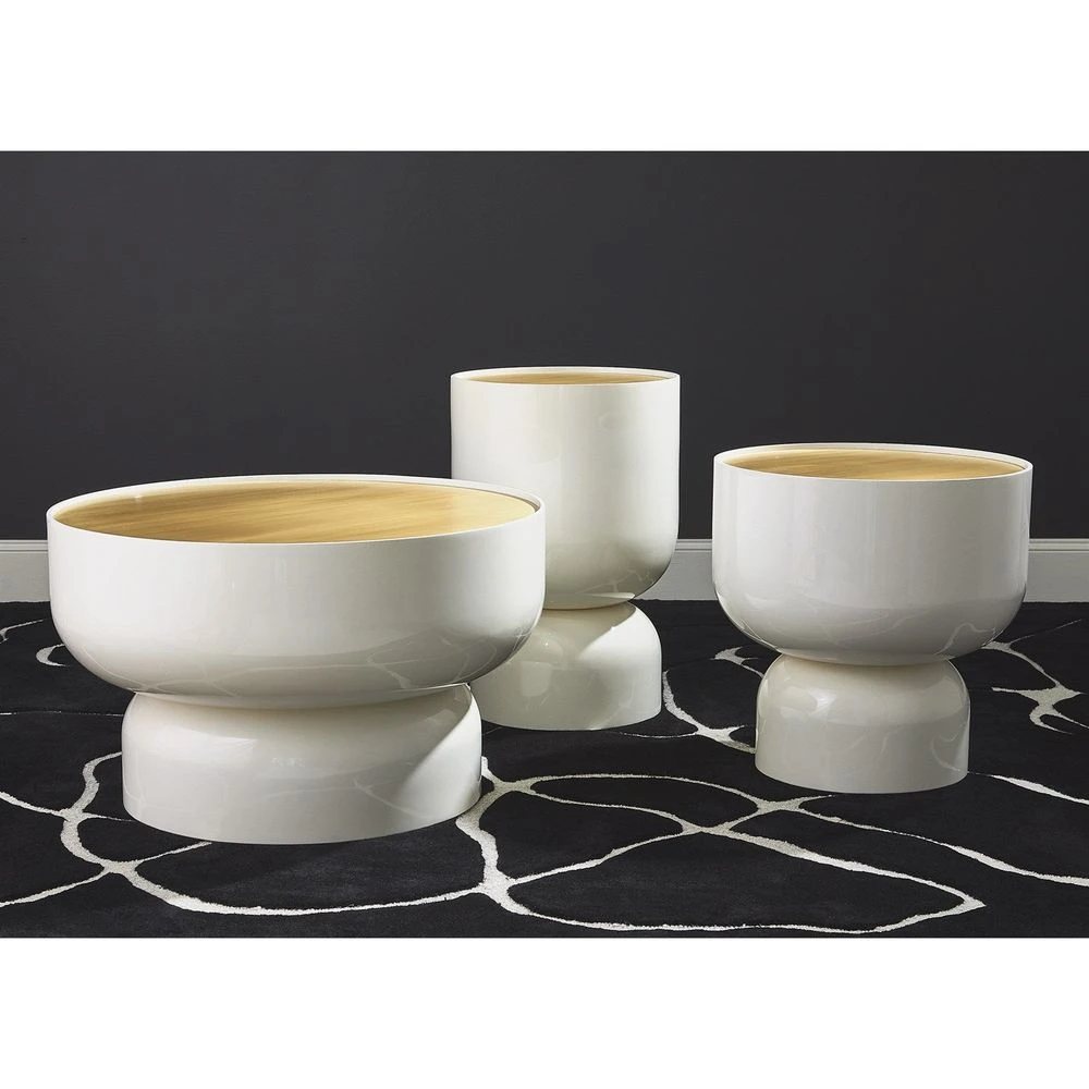 Description: An opportunity to be unique! The Three Kings Side Tables are designed by Julia Buckingham for Global Views and come in three shapes/sizes. One can mix and mingle these “Three Kings” tables in different ways. The simplicity of one as a singular, sculptural accent table is perfectly poised. Or, introduce one or two additional pieces to create a creative table arrangement of your own design. The Three Kings Side Tables are produced of solid wood and finished in a gorgeous off-white lacquer with gold leafed table tops.