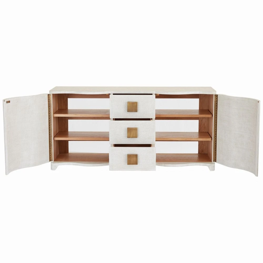 Description: Wrapped by hand in fine Belgian linen then given a multi-layered paint glaze, this collection features an oak-lined interior and custom hardware with antique brass finish. A technique that fell out of favor for many years, fabric-wrapping furniture is an exacting art we have revived with the help of one of the industry’s leading manufacturers of fine accent furniture. Slat back design allows for easy access to component wiring.