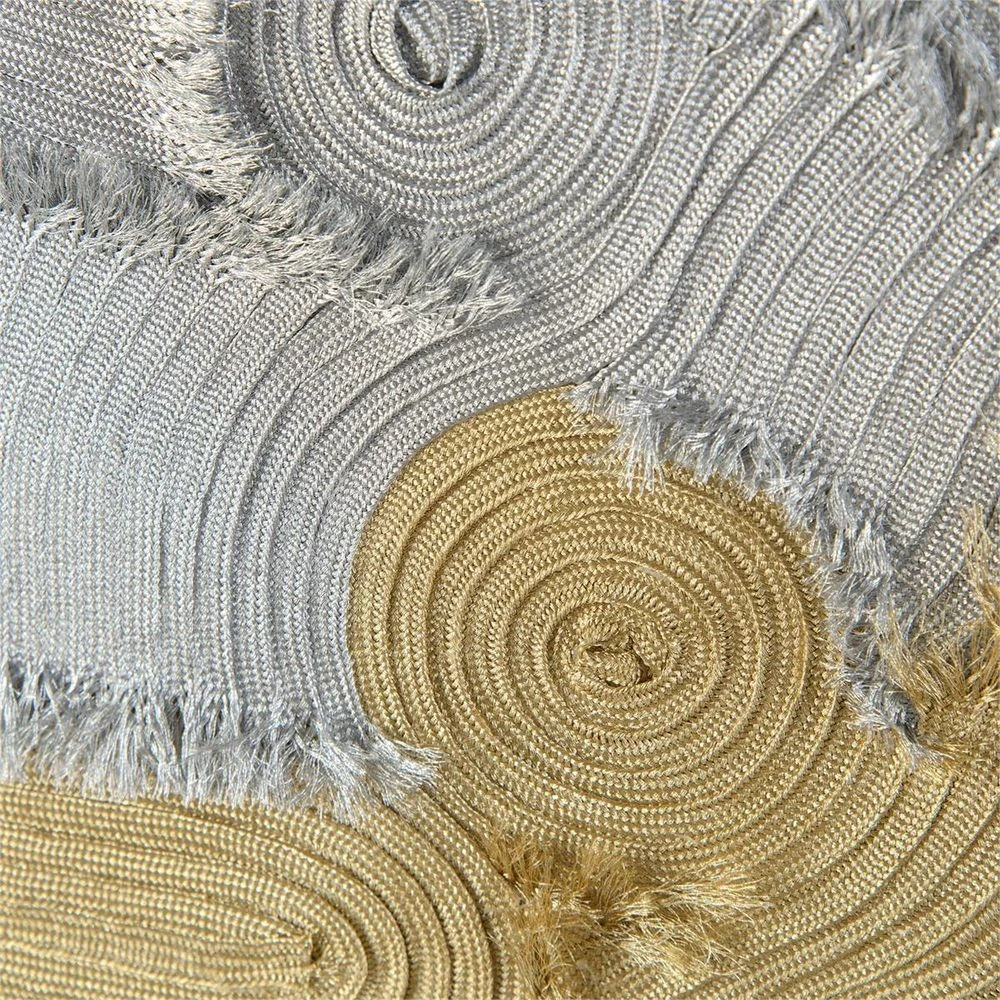 Fabrics in gold and silver with fringed edges are pieced together in this original design by Daniel Fey. The art is framed under glass in a gold molding.