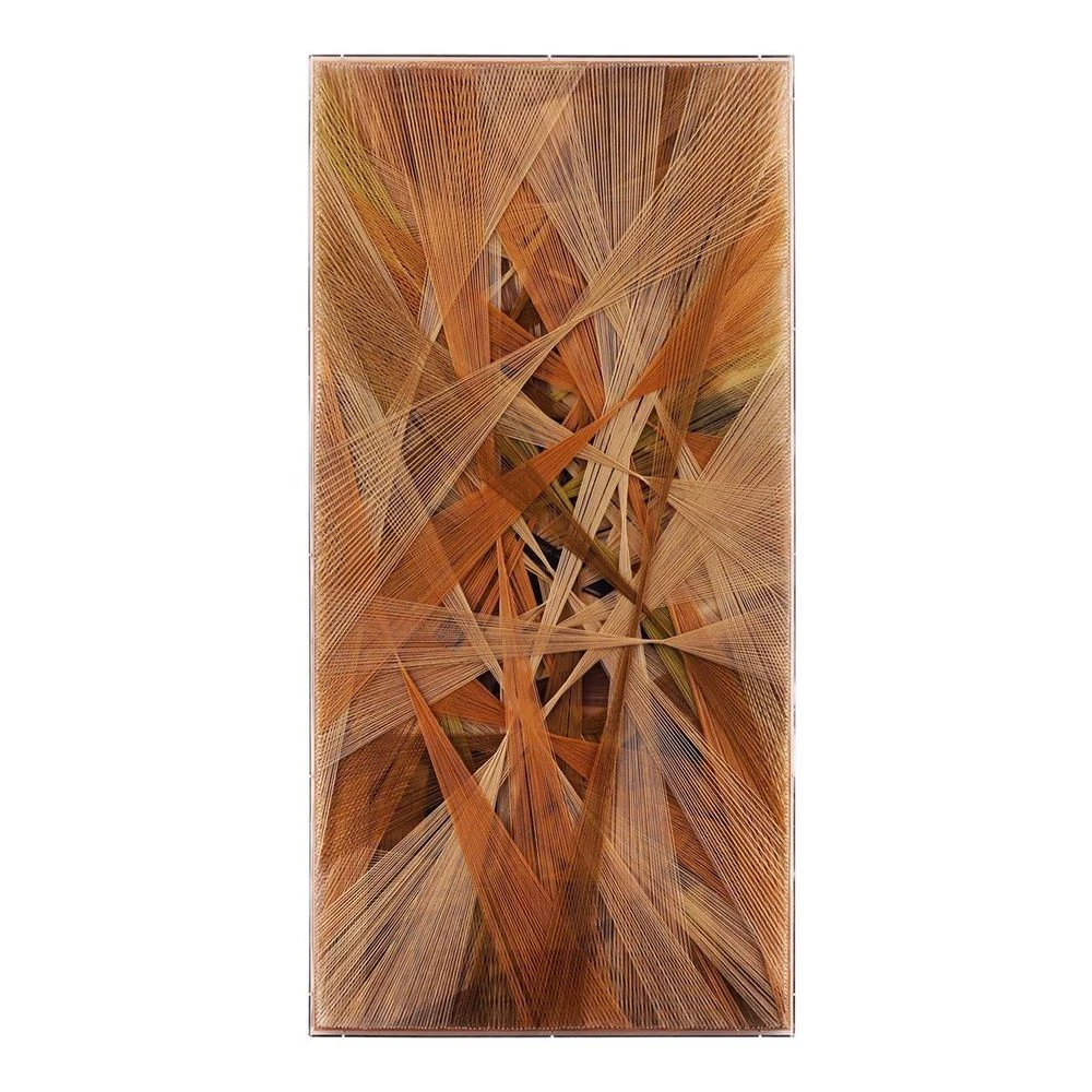 Threads of Fate by artist Daniel Fey showcases a dimensional web of colorful threads affixed with steel pins on canvas. This stunning piece, rich in visual depth, is displayed from a clear acrylic box.