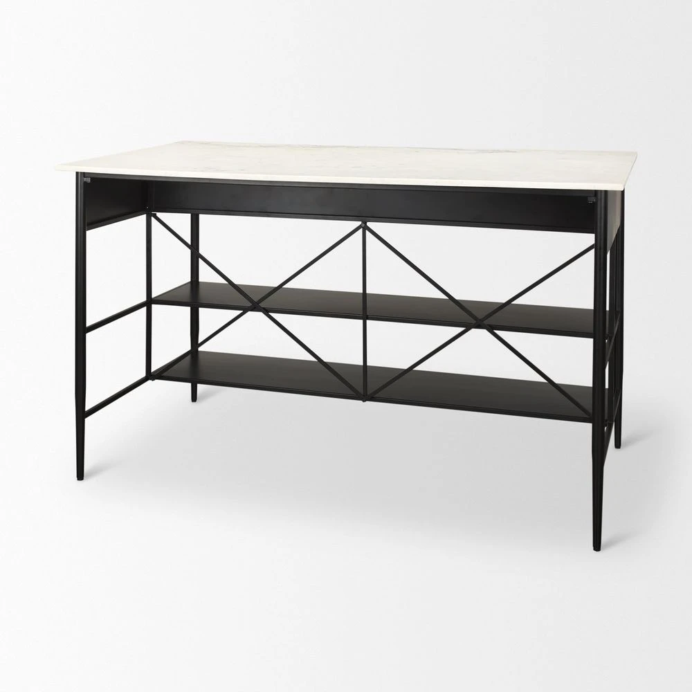 Description: Toryn Kitchen Avand is a chef’s style portable island made of black iron metal and white banswara marble top with polished, smooth, straight edges and features three drawers and two shelves.