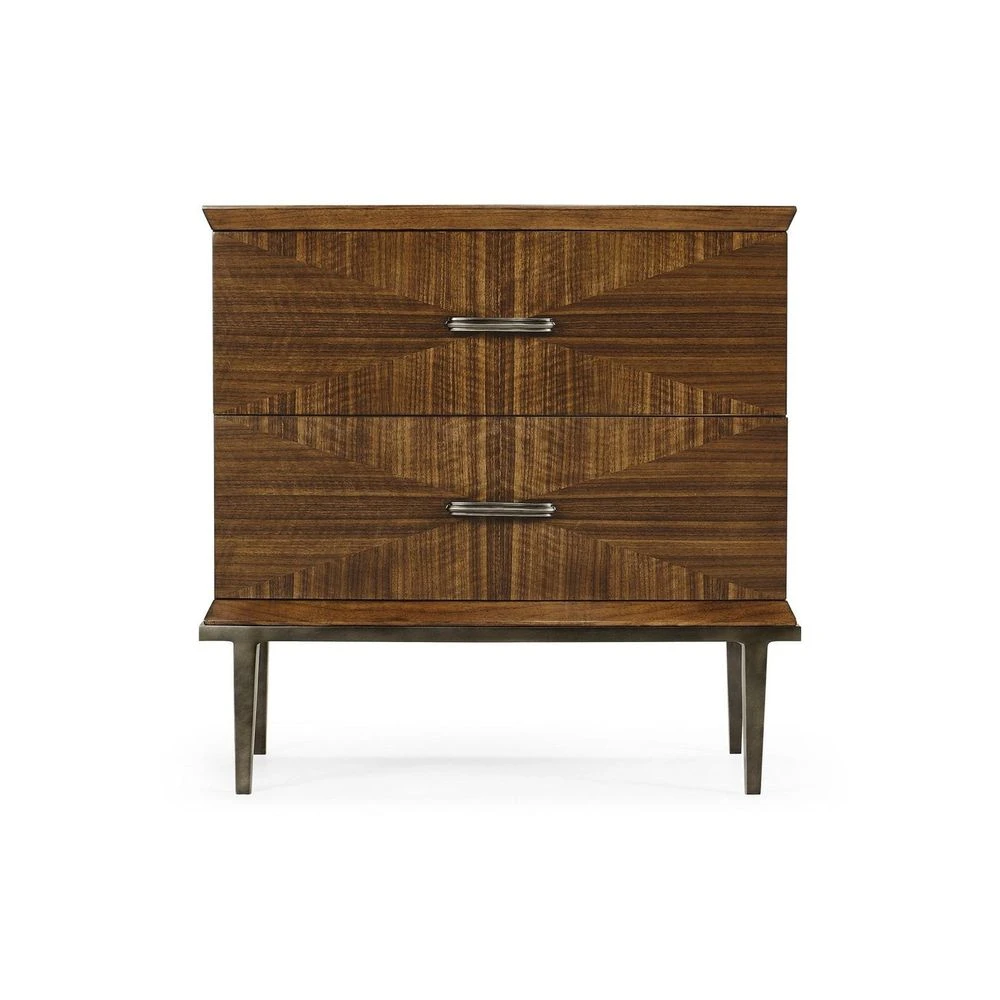 This cabinet is constructed of American walnut with a transparent, hand rubbed finish. Drawer fronts feature walnut veneers in a box match veneer layup. Sides of cabinet feature face grade veneer. Hardware is cast from brass and acid dipped and hand rubbed to achieve a deep, natural patina. Sides of cabinet display face grade veneer.