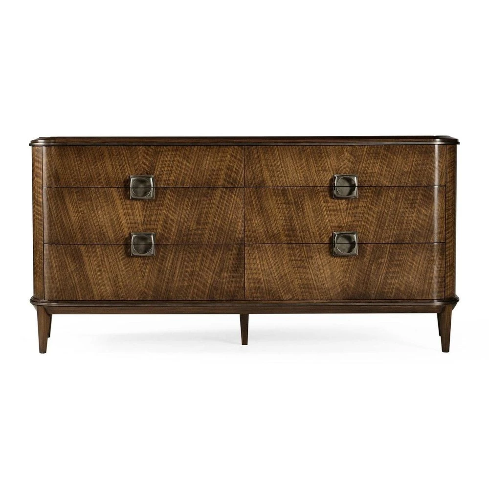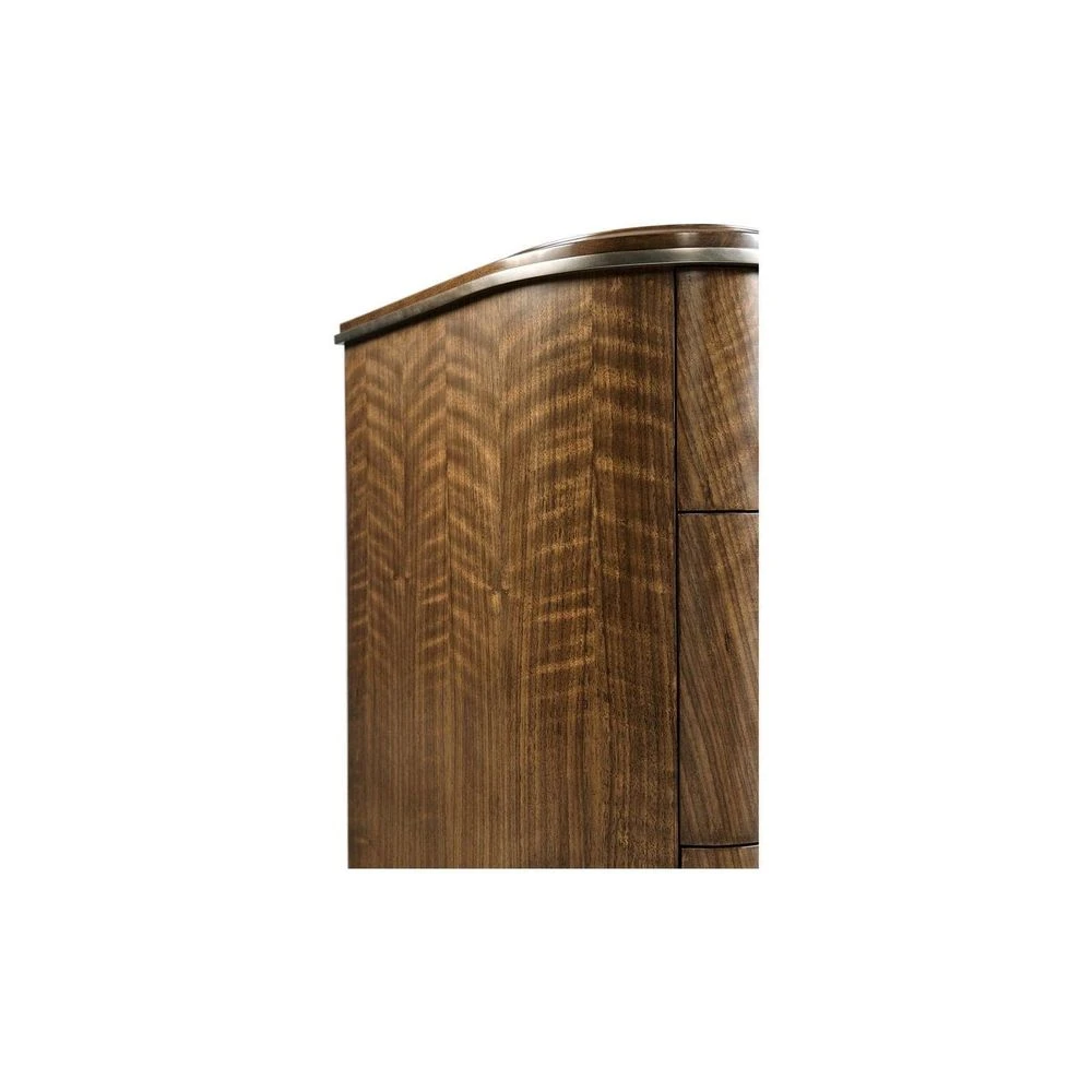 Informed by French Modernism, this cabinet is constructed of walnut with a transparent lacquer finish. Top features walnut veneer in a pattern reminiscent of straw work. Hardware is cast in the Jonathan Charles foundry where it is acid dipped and hand rubbed to achieve a rich, natural patina.