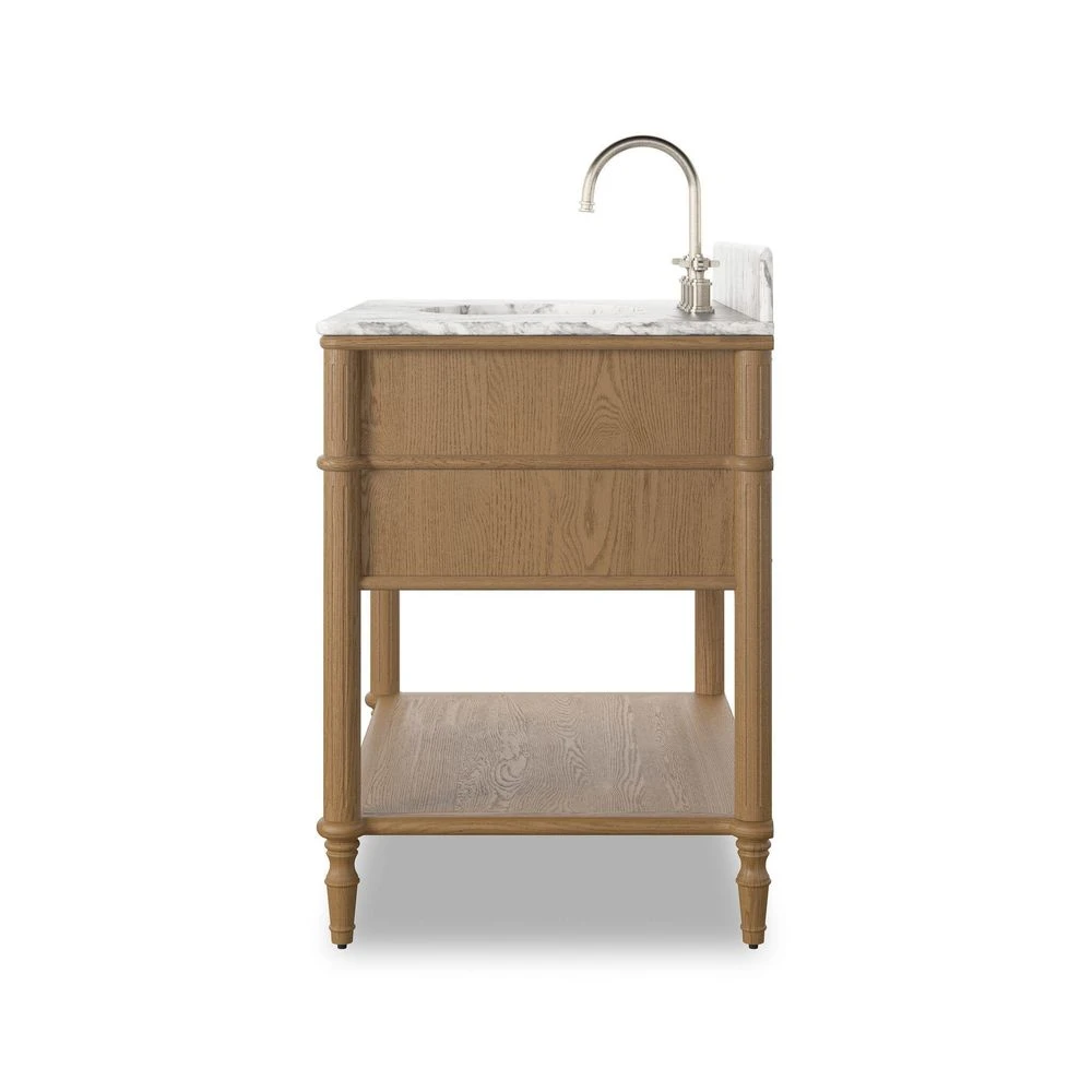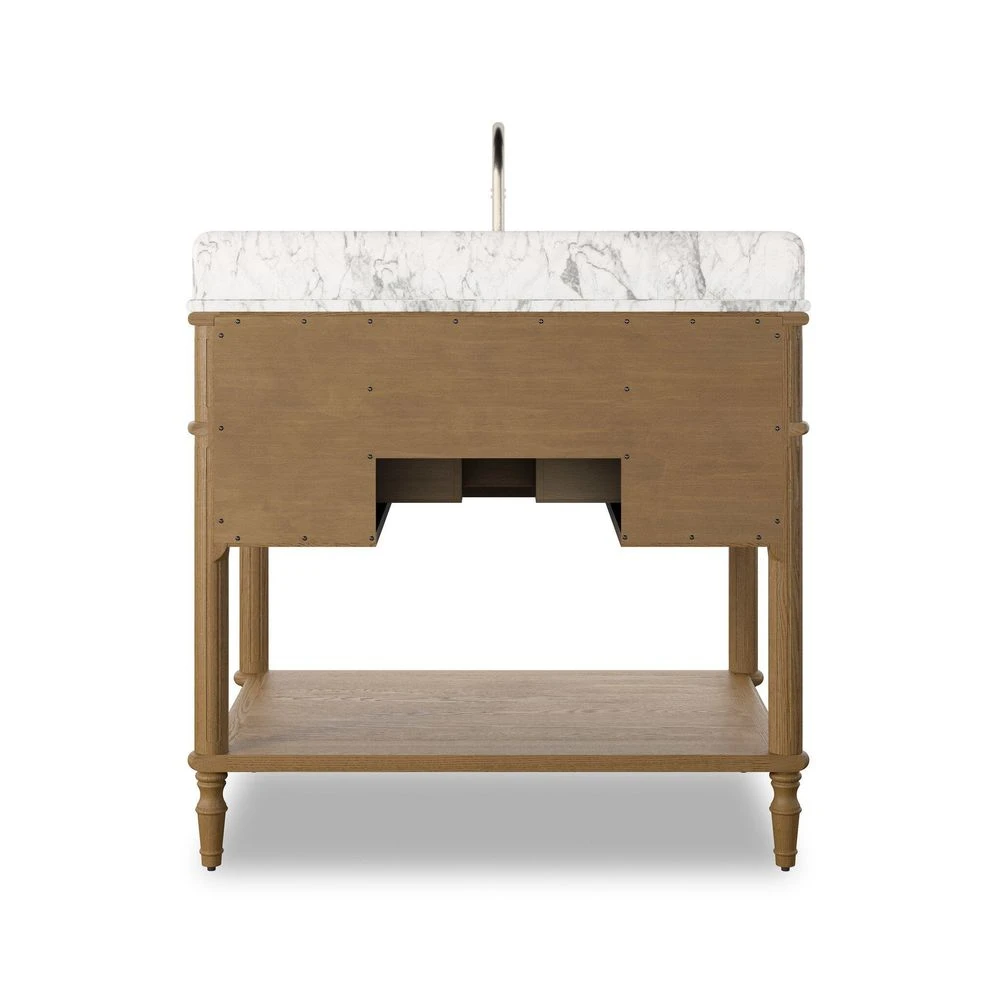 Description: Influenced by vintage European lines, this inspired bath vanity brings a sense of calm and serenity to the bath space. Crafted from solid oak and veneer with rounded corners and tapered spindle legs in a natural washed blonde finish, aged satin brass hardware and a Carrara marble top. Includes top faux drawer, bottom drawer with U-shape cutout to accommodate plumbing fixtures and a deep open shelf below. Finished with a bath-safe sealant for moisture resistance. Designed to accommodate 8â€Â-widespread faucets and standard-size hardware for easy customization; faucet shown not included. Sink and backsplash included; backsplash ships separately. Removable back with cutouts for plumbing; fits standard P-trap. Professional installation required.