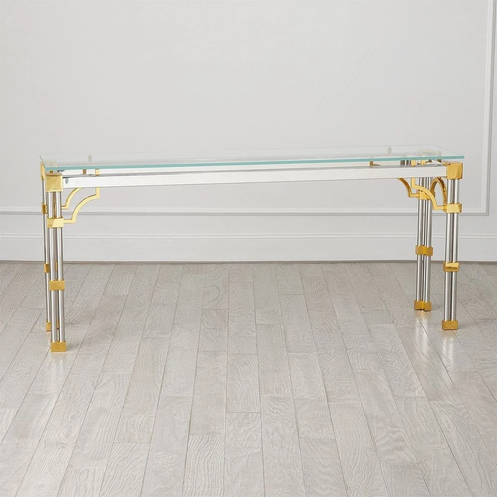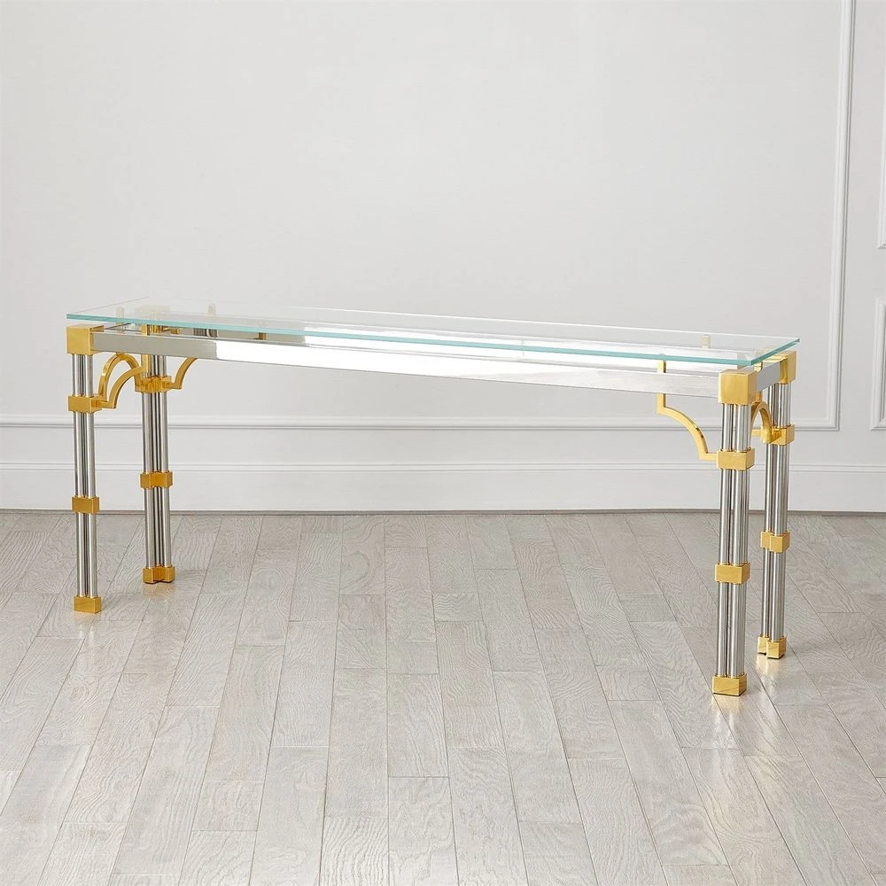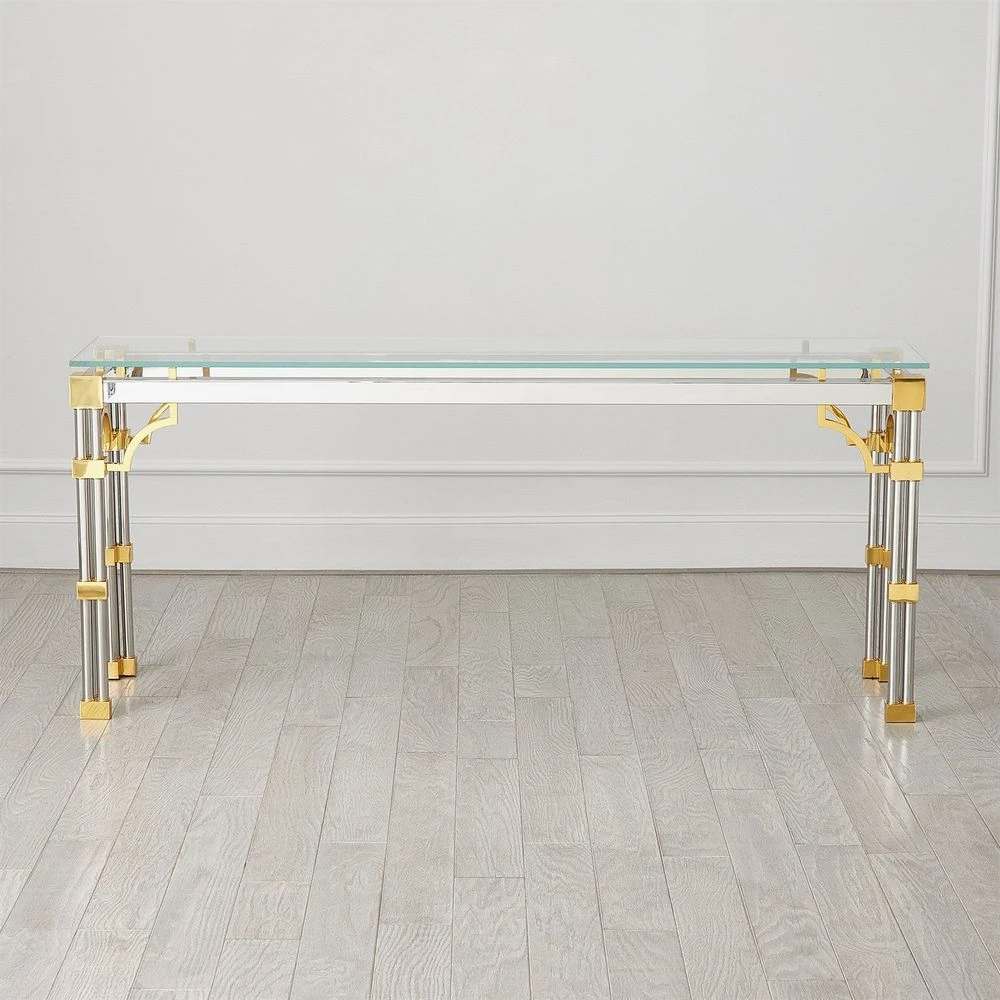 Description: The Tri-Column Collection is a tribute to the historical windows of Venice, featuring quatrefoil design accents that exude sophistication. Crafted from brass with a gleaming shiny brass finish, stainless steel with a nickel-plated finish, and topped with tempered glass, these tables are an exquisite blend of artistry and functionality.