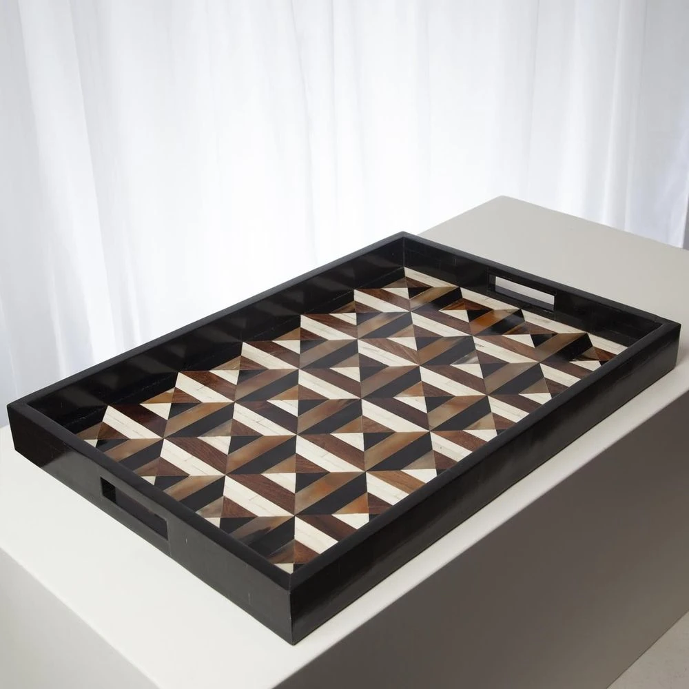 Triangular shaped bone, horn, resin and sheesham wood create the optical patterns on the surfaces of this collection. The exterior is covered in these highly detailed patterns, which are all cut, laid up, and hand applied. The substrate of MDF give these items strength and stability to hold up over time without warping or movement.