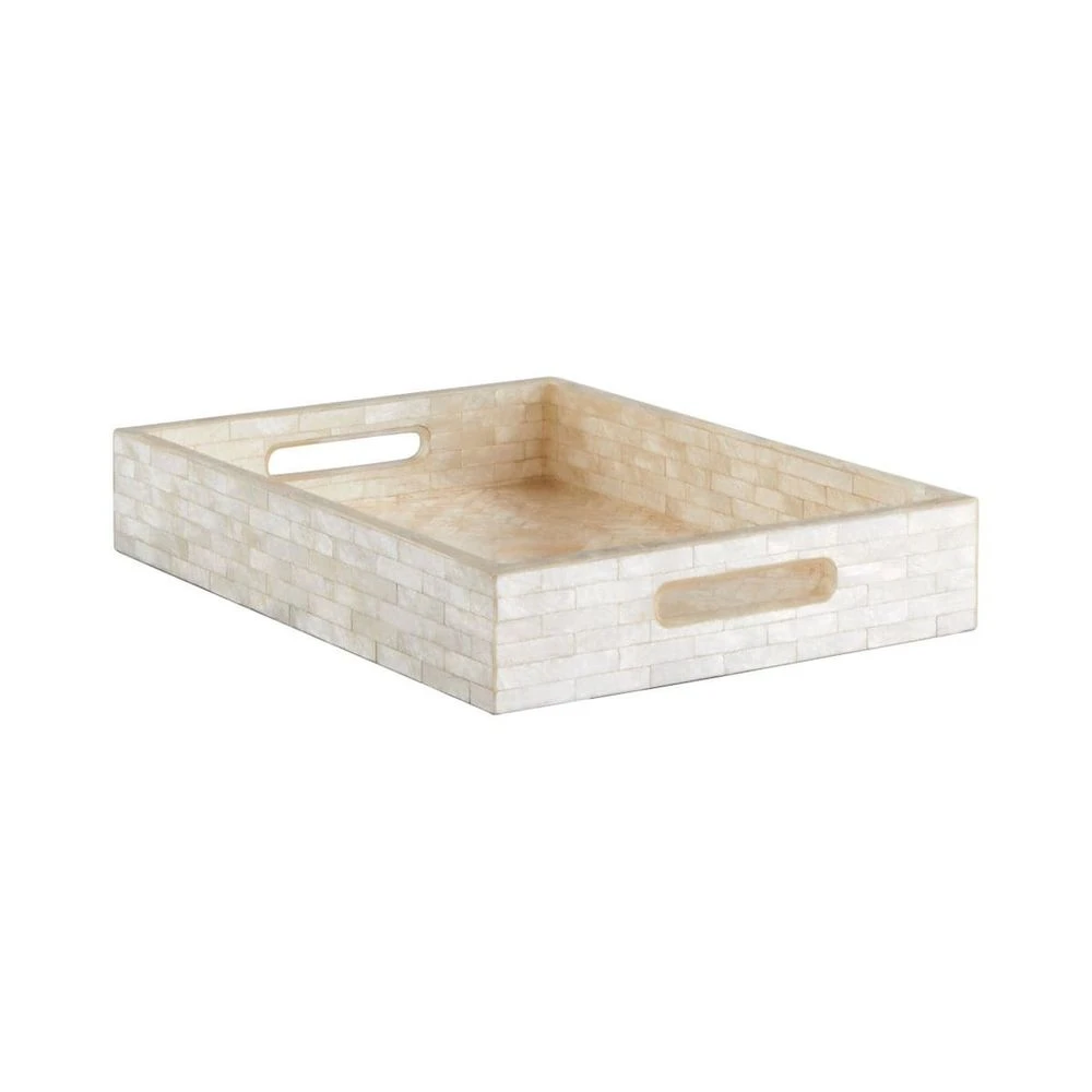 The Triton collection features the centuries-old, enduring beauty of the capiz shell. Harvested from sea mollusks native to Southeast Asia, the capiz shells are delicately fixed to wood trays that feature a raised rim with two cutouts for handles. Natural tones in the capiz shell add a subtle iridescence. The Triton trays are available in two shapes of two sizes and colorways.