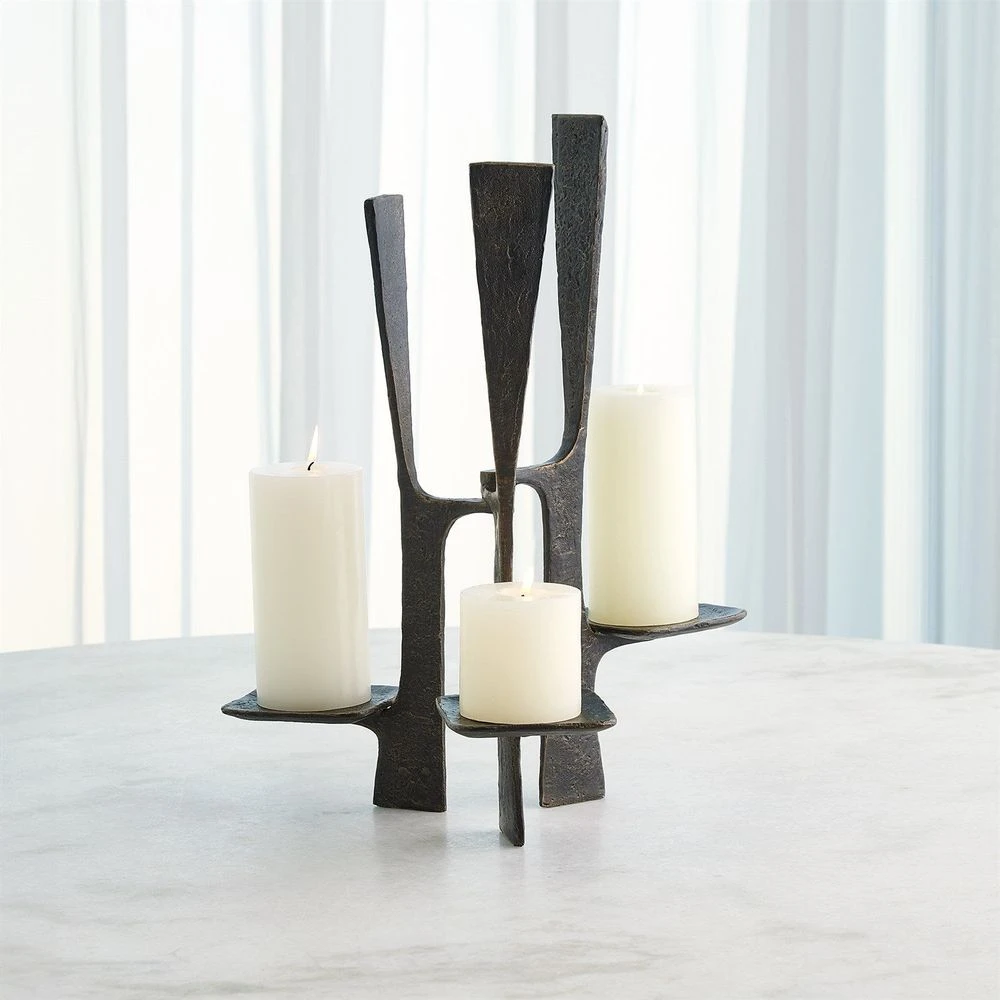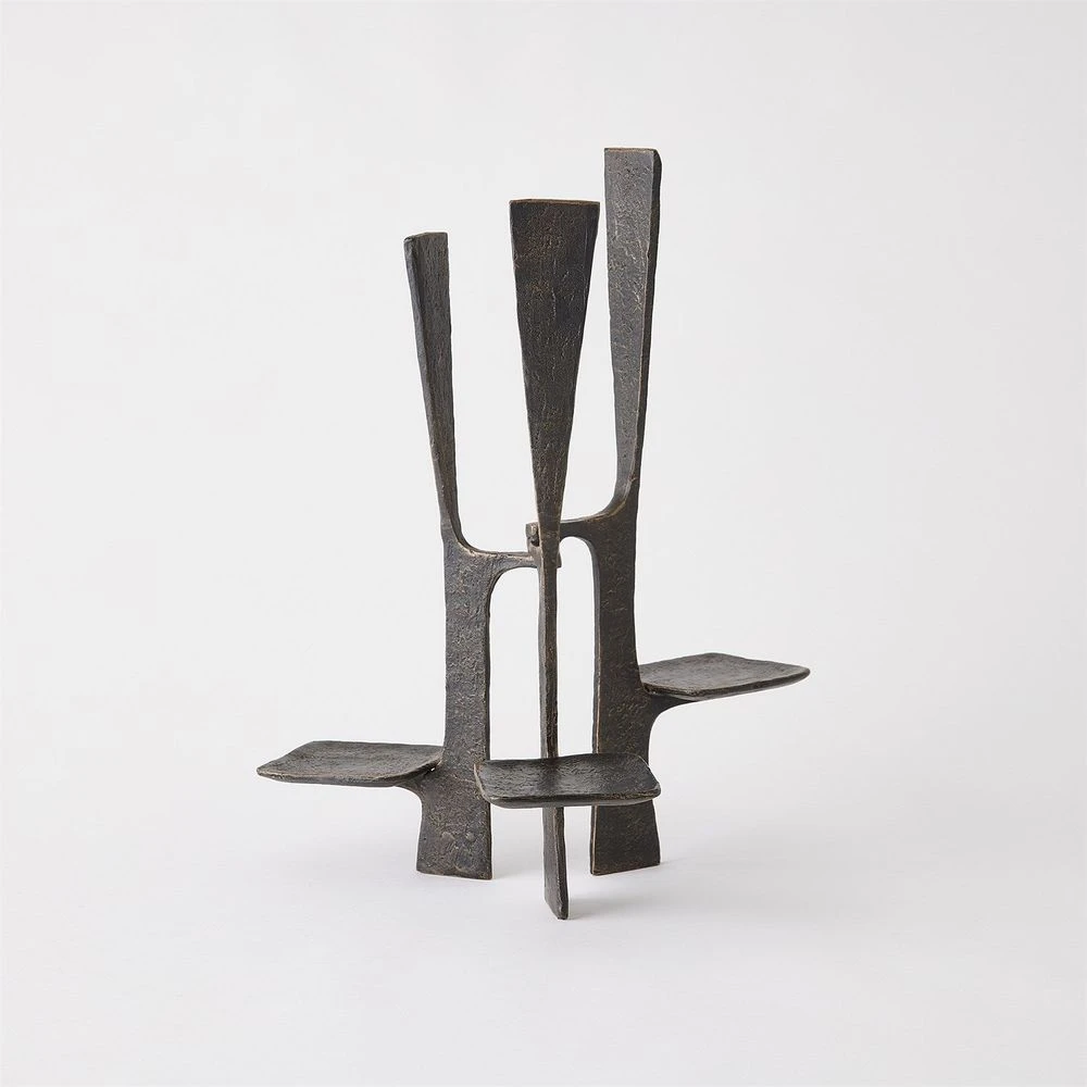 Description: Illuminate your space with the Triune Candleholder, crafted from cast iron and adorned with a hand-applied bronze finish. This elegant piece holds three candles, creating a warm and inviting ambiance for any setting.