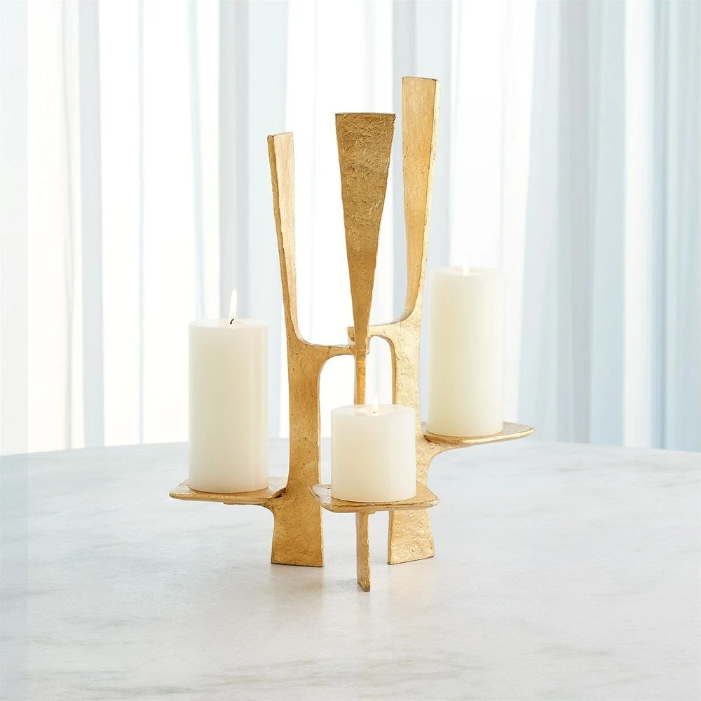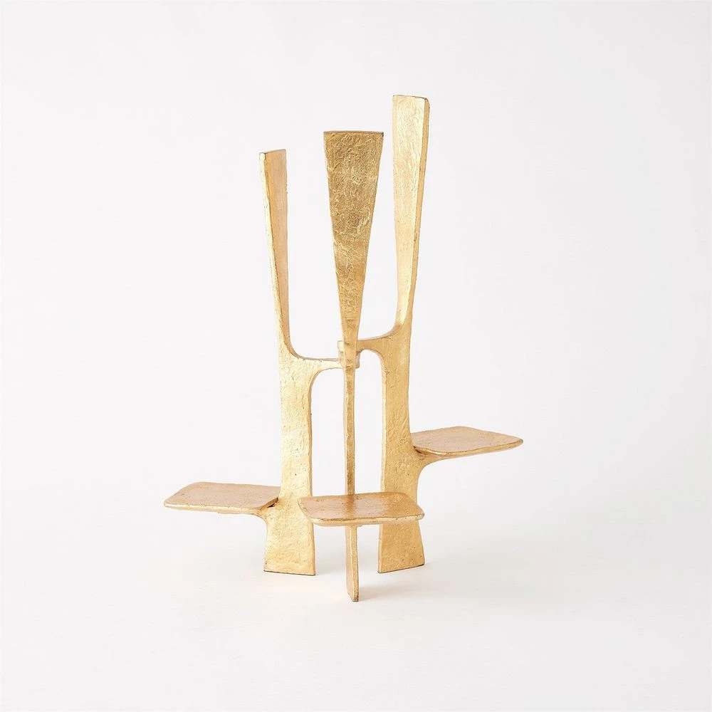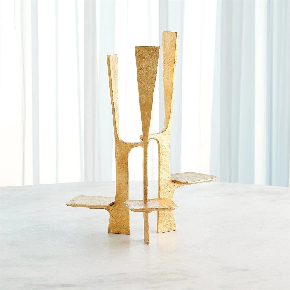 Description: Illuminate your space with the Triune Candleholder, crafted from cast iron and adorned with a hand-applied gold leaf finish. This elegant piece holds three candles, creating a warm and inviting ambiance for any setting.
