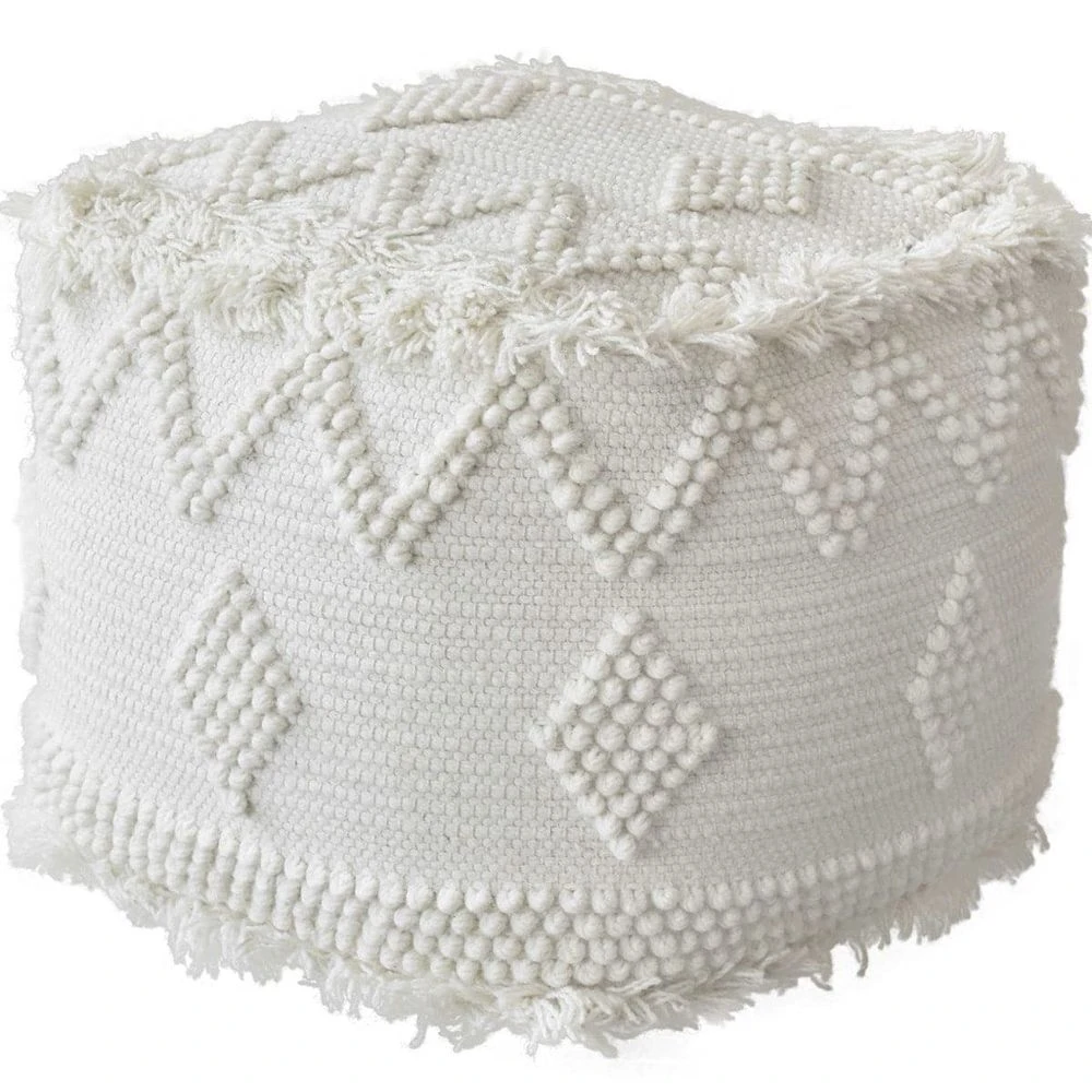 Handwoven from a blend of wool and cotton in soft ivory, accented with raised bohemian inspired patterns and fringed edges.