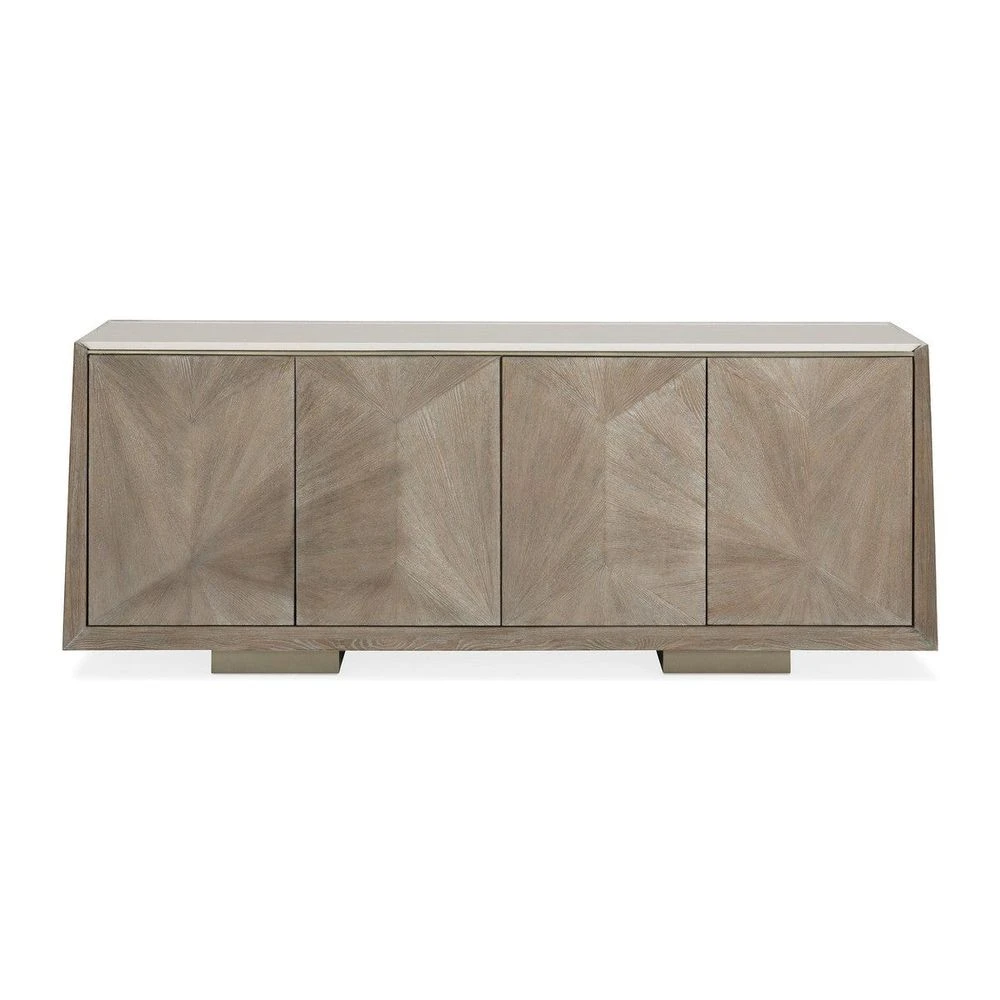 No matter which way you see this gorgeous console, you can’t help but admit it has a lovely Point of View. A straightforward silhouette showcases its extraordinary linear veneer patterns and is topped with a Cream stone top that ensures usability and durability. Block feet and a soft tonal finish of Ash Driftwood convey its relaxed attitude while a bead of Sundance Gold gives the top edge a touch of luxe. Touch-latch doors open to reveal a fully finished interior painted in Putty with plenty of storage and an adjustable shelf and drawer behind each of its four doors.