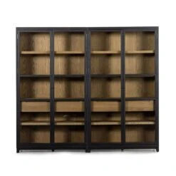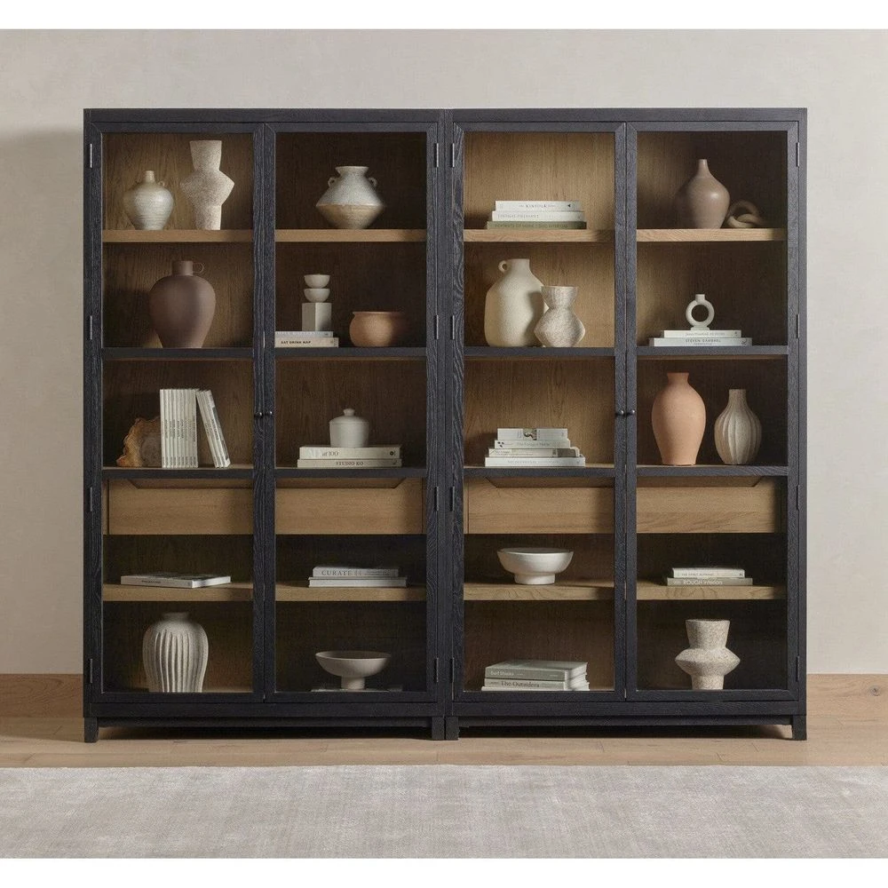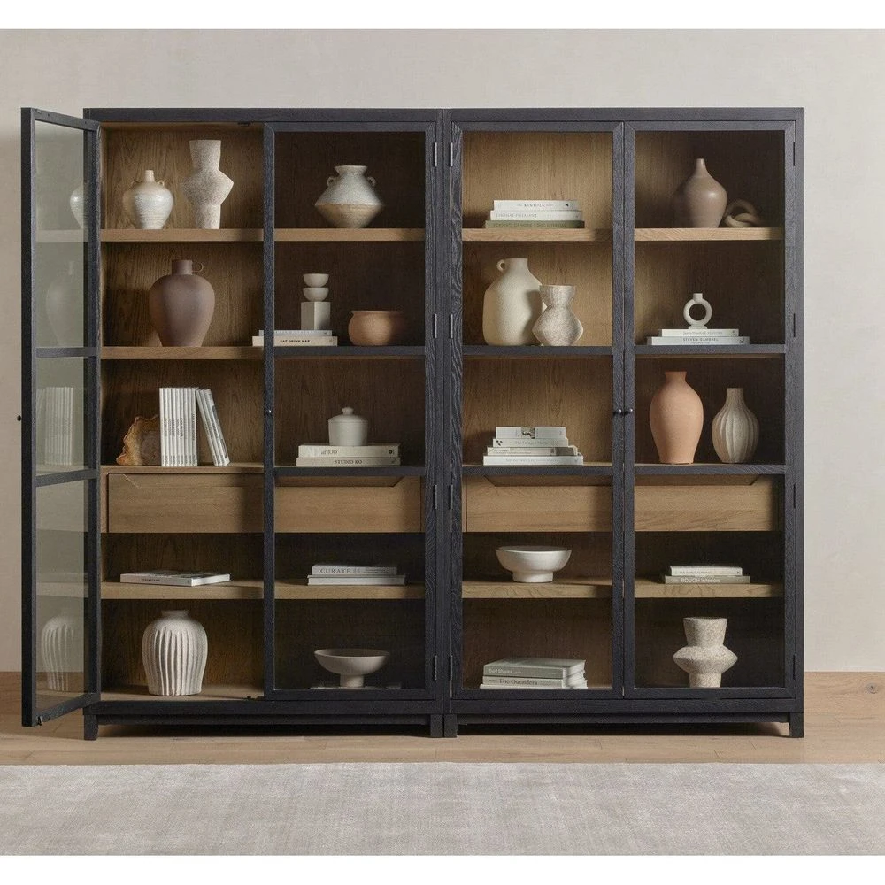 - Description: Two-tone transparency. Black drifted oak frames lighter interior shelving for subtle but striking contrast. Glass doors allow for prized possessions to dazzle on full display while spacious interior drawers add out-of-view storage.