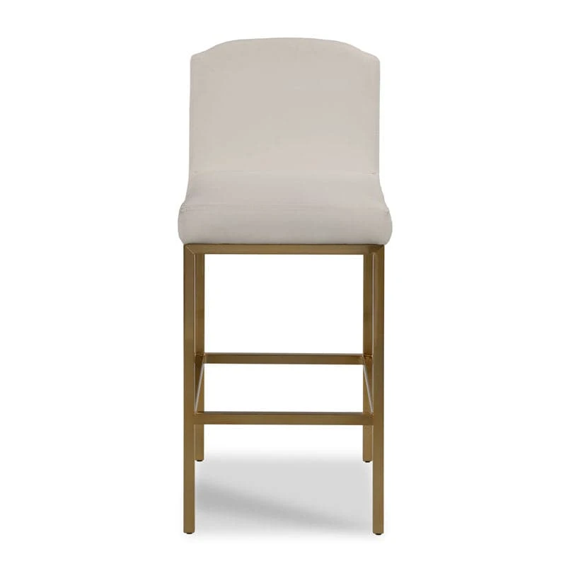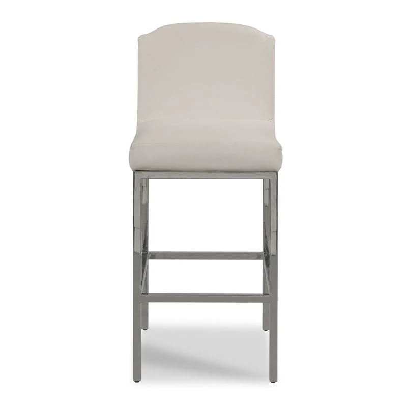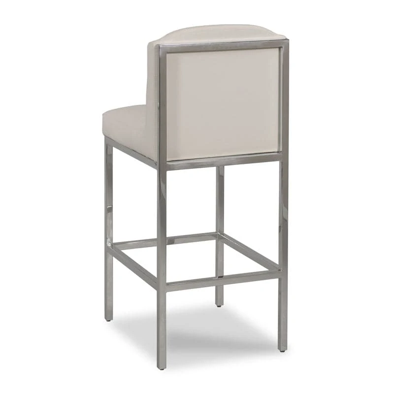 This post modern stool features linear styling with an upholstered back and seat that are elevated on a stainless steel base of square posts and a low stretcher.