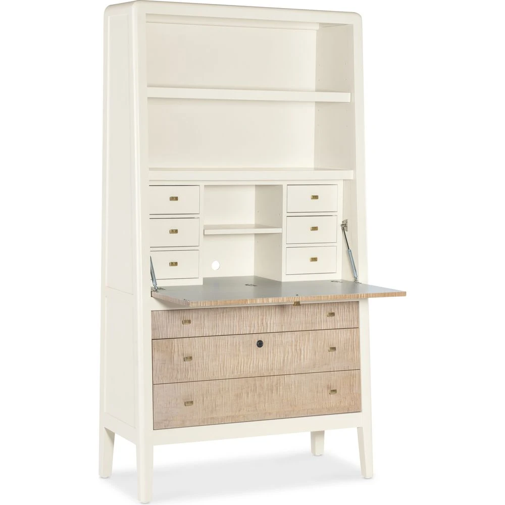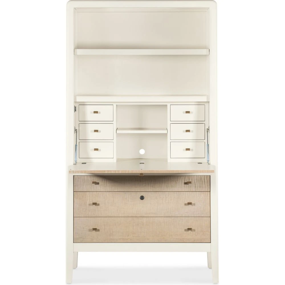 Description: Contrasting a serene Almond White finish with Maple and Figured Maple Veneers on the drop-down front and drawer fronts, the Venus Hub gets you organized and keeps clutter out of sight. Perfect for the kitchen, bedroom, loft or living space, it has one adjustable wood shelf in the top section and one fixed wood shelf in the top section. The drop-front writing surface opens to reveal 6 small drawers and one adjustable wood shelf. There’s a cutout in the back panel for wire management and two bottom drawers underneath the drop-front area. The top drawer has a cream-colored removable felt-lined tray, and the bottom drawer has a lock and two compartments. The right compartment has hanging file storage. The left compartment has a removable tray.