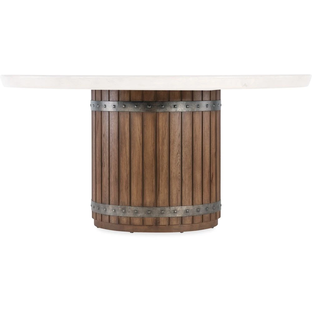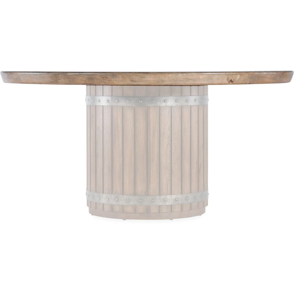 Description: Inspired by the casual wine country lifestyle, the 62-inch-round Vineyard Row Dining Table has a wine-barrel-shaped base and a two-tone finish combining the light-and-airy Sonoma on the top and the robust Napa finish on the base, both over Pecky Hickory wood.