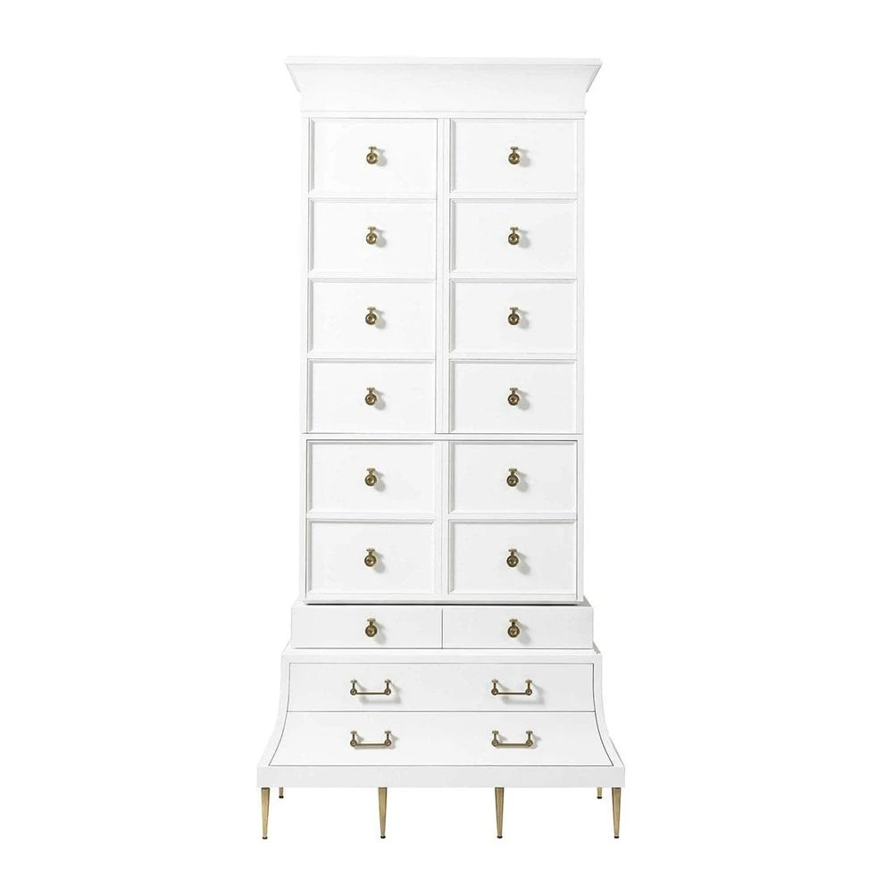Exquisitely designed and detailed versatile cabinet made of Italian ash with white finish, solid European birch, and American walnut with custom designed brass finished hardware. Three drawer chest supports case with faux drawer front. Top cabinet opens to rich American walnut workspace with five drawers providing the perfect space for laptop or writing. Cabinet above workspace holds two removable adjustable shelves providing space for flat screen TV , electronic components, or storage. Access for electric wiring provided in both compartments.