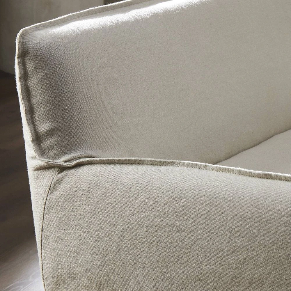 Introducing a sustainable take on slipcovered seating. A relaxed dining bench is upholstered in soft, sustainably made Belgian Linen™, with solid oak legs. Libeco™-sourced Belgian linens are 100% natural and free of toxic chemicals. Certified Oeko-Tex® STANDARD 100, slipcovered styles are fully removable and machine-washable for easy care.