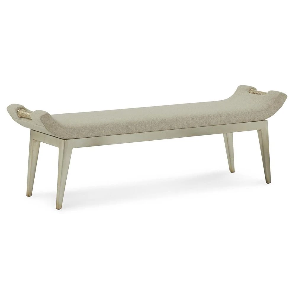 The Tailfin Bench is a refined, sophisticated seating solution that contributes enchanting curvature and lavish tones to any décor. The piece showcases a seductive profile as the cushion displays a slight upward curve with slender metallic handles on each side. Upholstered in Naima Linen 2209 fabric, the piece displays tasteful, neutral tones that beautifully complement the beech wood frame in a champagne silver finish.