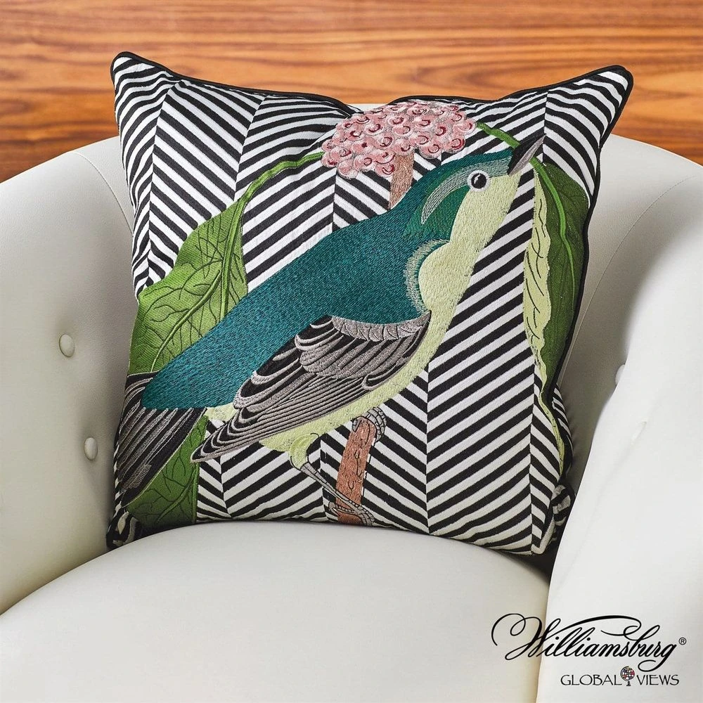 Williamsburg for Global Views. The Wood Warbler Pillow is hand-embroidered and inspired by exquisite images painted by ornithologist John James Audubon for tome, ‘Birds of America’ first published in 1827. Colonial Williamsburgs rare book collection contains an early edition of Audubons masterwork, from which the images were drawn.