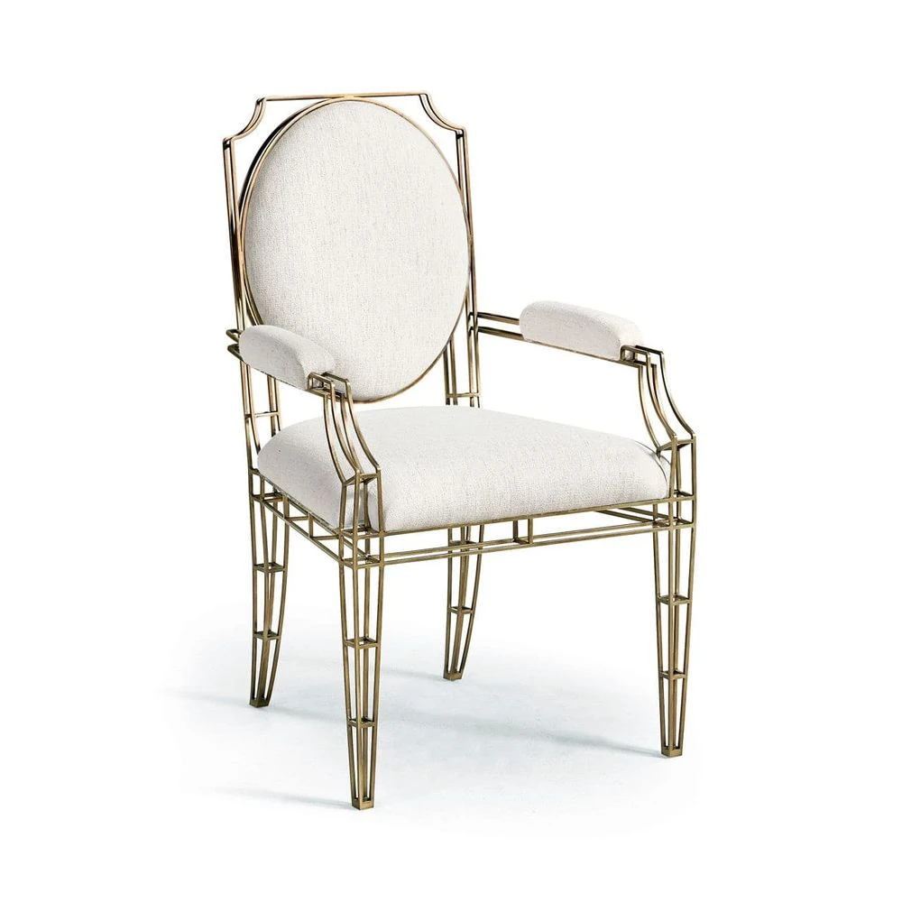 Exoskeleton metal frame finished in Bronze and upholstered cream colored performance fabric.