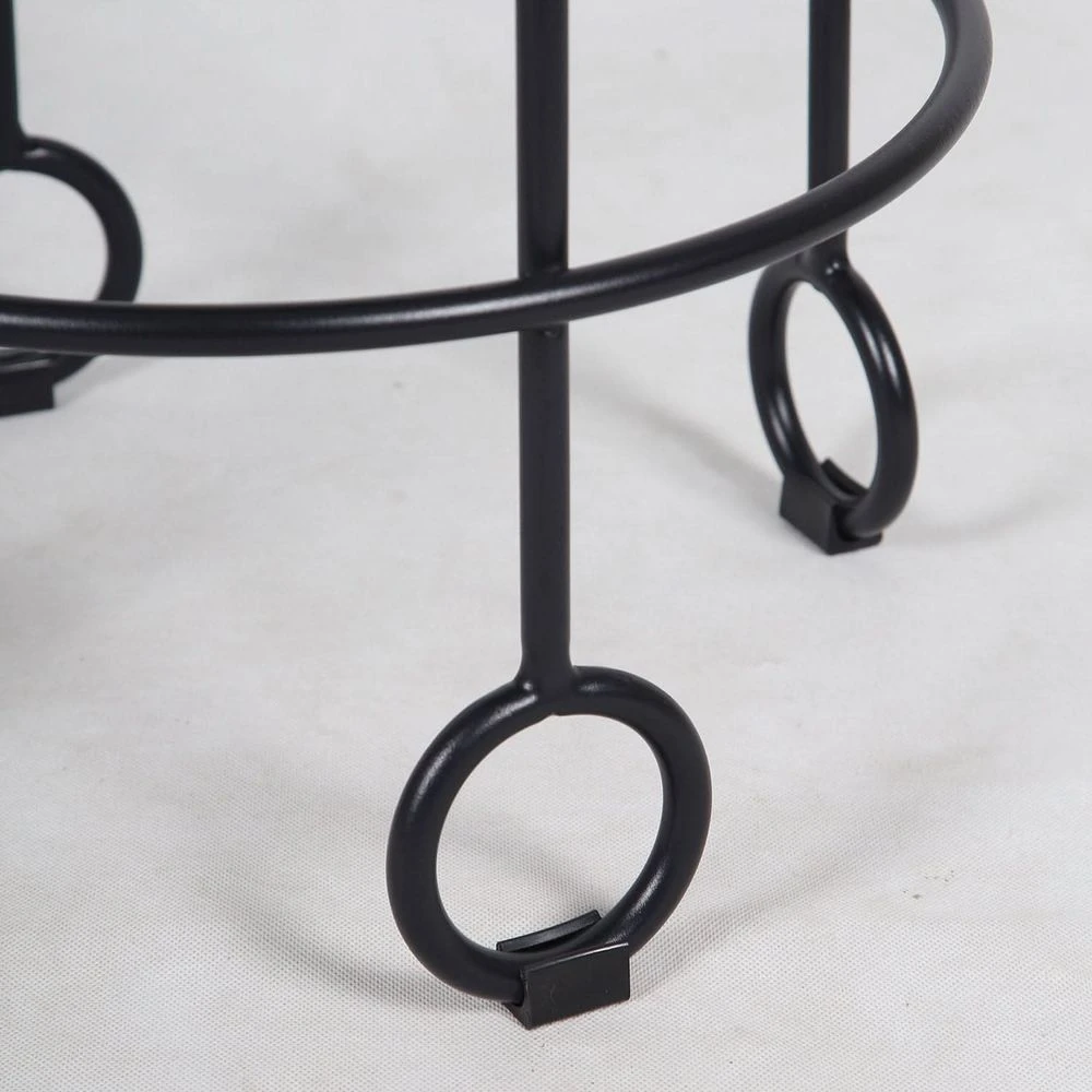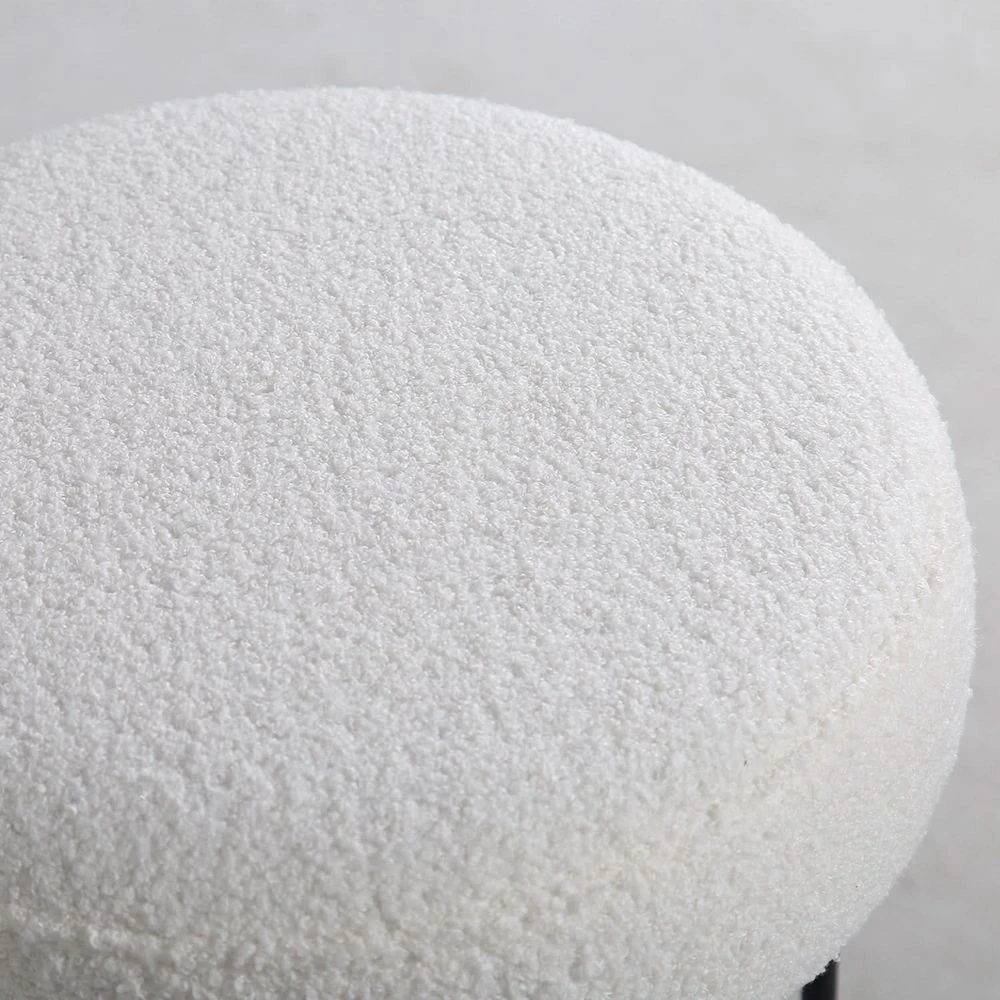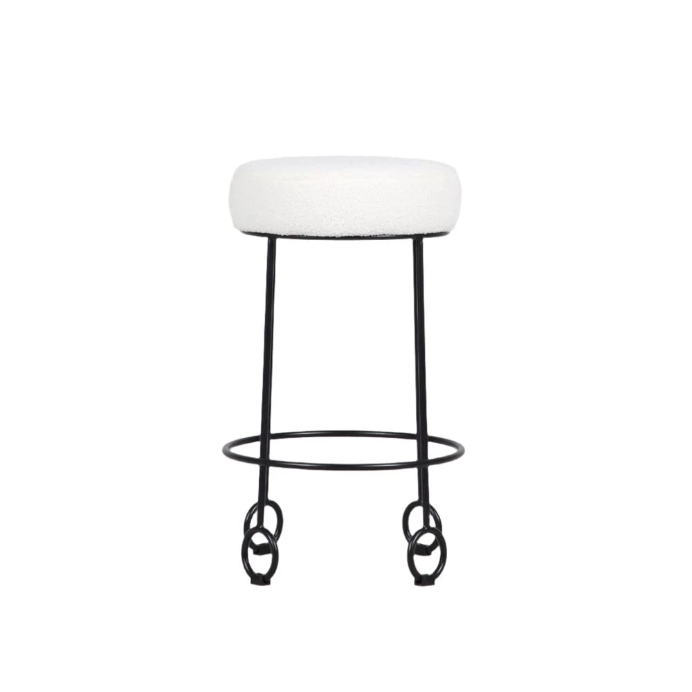 Introducing the Yo-Yo Stool, a perfect blend of elegance and whimsy inspired by the French modernist designs of the 1950’s. This stool features a sturdy black iron base with unique ringed feet that mirror the round shape of its white fabric upholstered seat. The contrast between the dark iron and the crisp white fabric creates a visually appealing balance that will enhance any space.