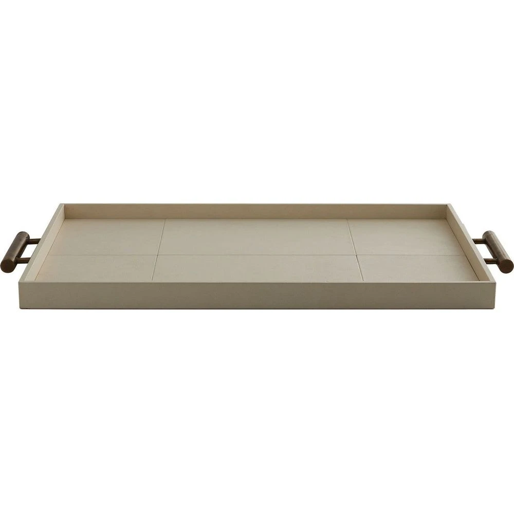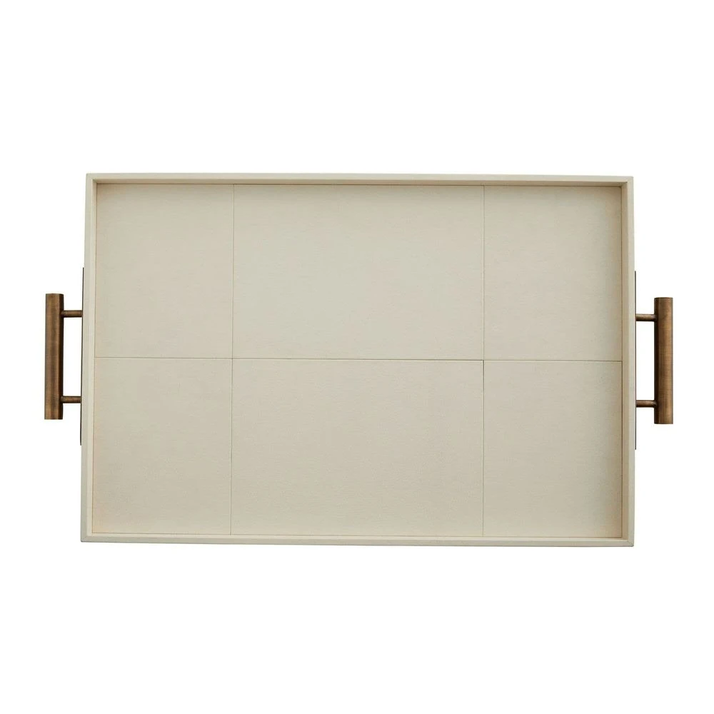 Elegant geometry and refined materials bring this contemporary tray to life. Wrapped entirely in supple ivory leather with tailored stitching is beautifully crafted, adding to its quality and charm. For ease of use, brass handles rest on either side – each finished in a classic antiquing. Leather will vary.